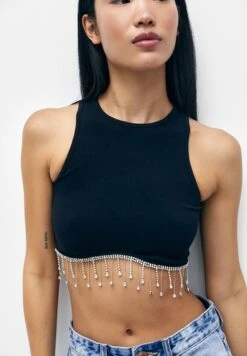 PULL & BEAR Crop Top With Rhinestone-Embellished Hem – Top – Black