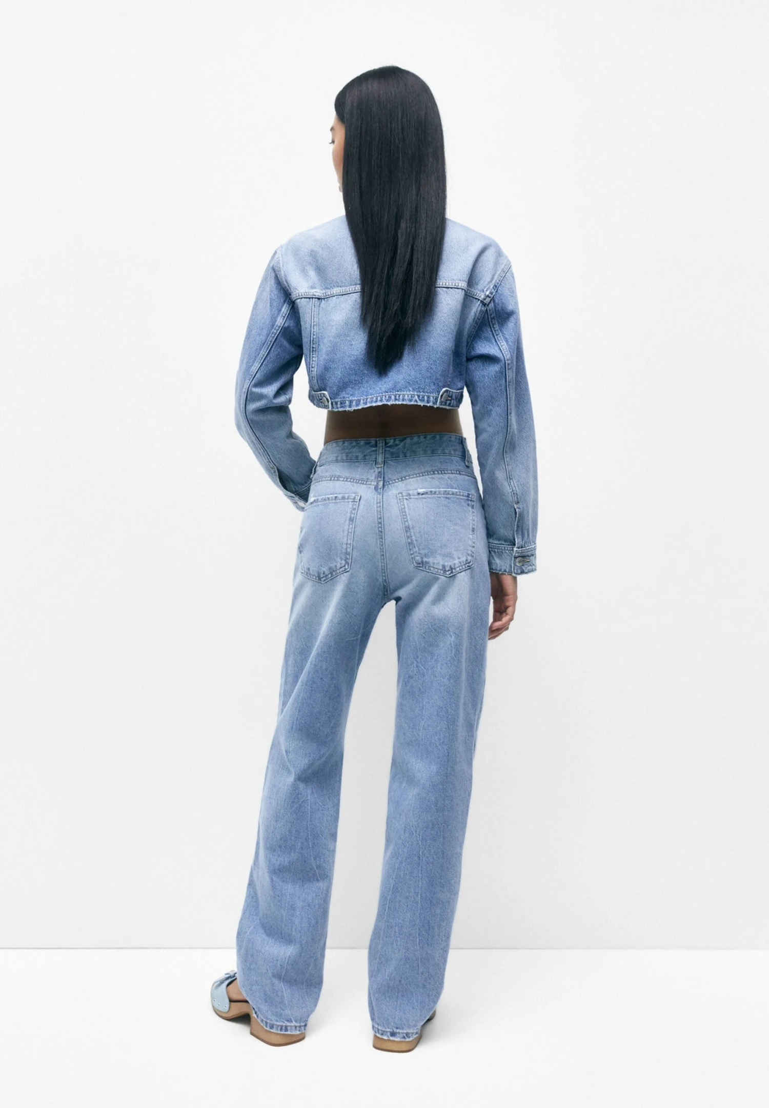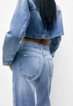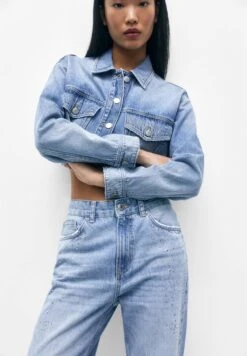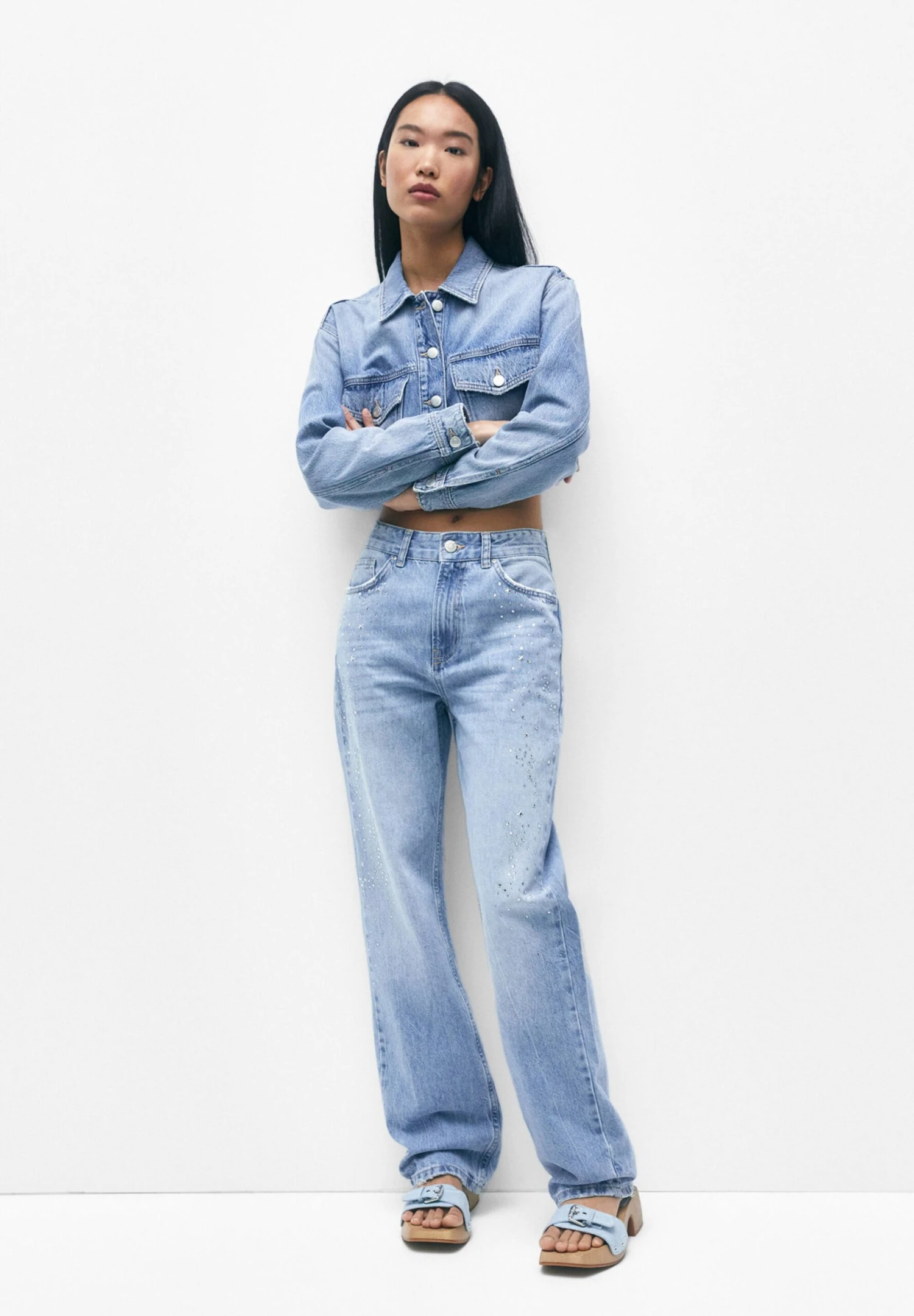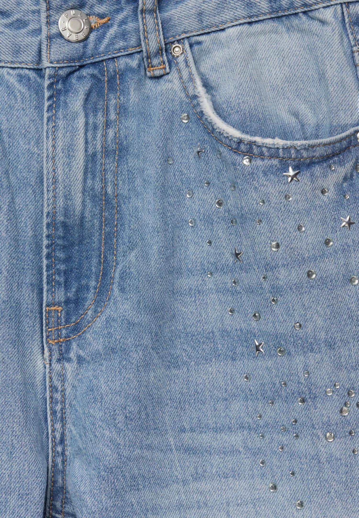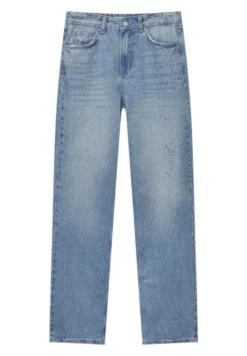 PULL & BEAR Mid-Waist With Rhinestones – Straight Leg Jeans – Stone Blue Denim