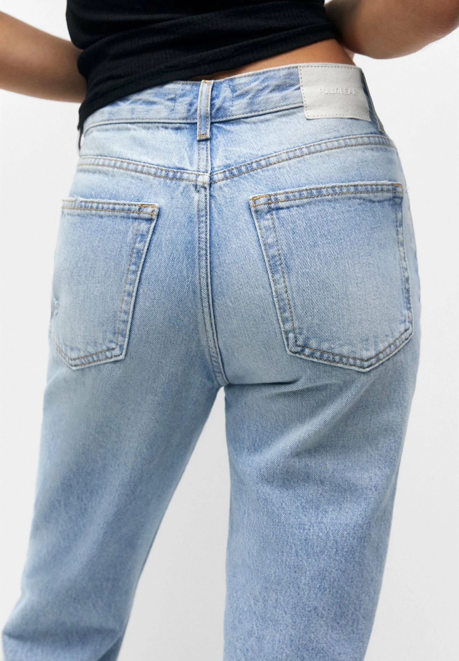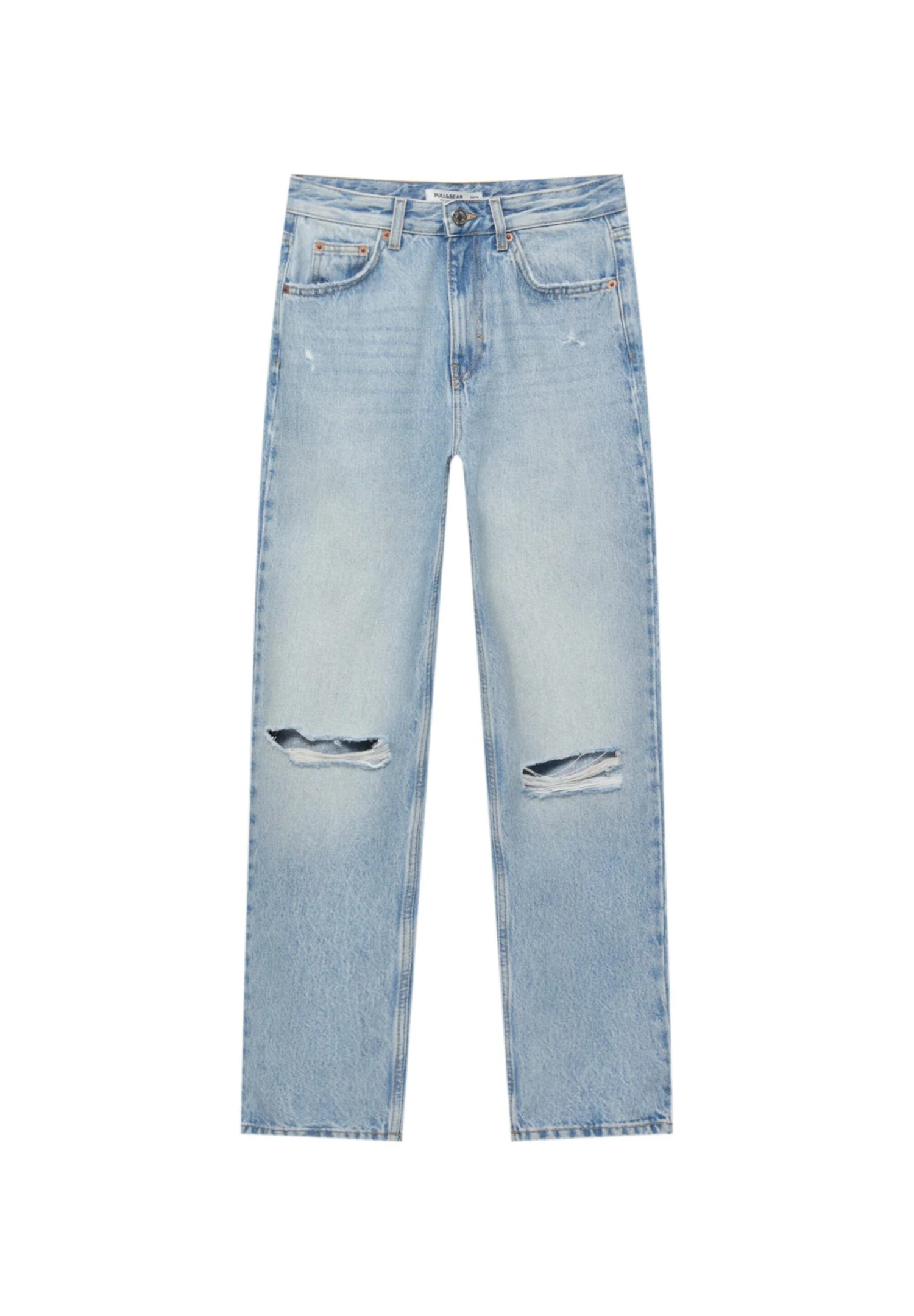 PULL & BEAR Ripped Mom – Straight Leg Jeans – Stone Blue Denim