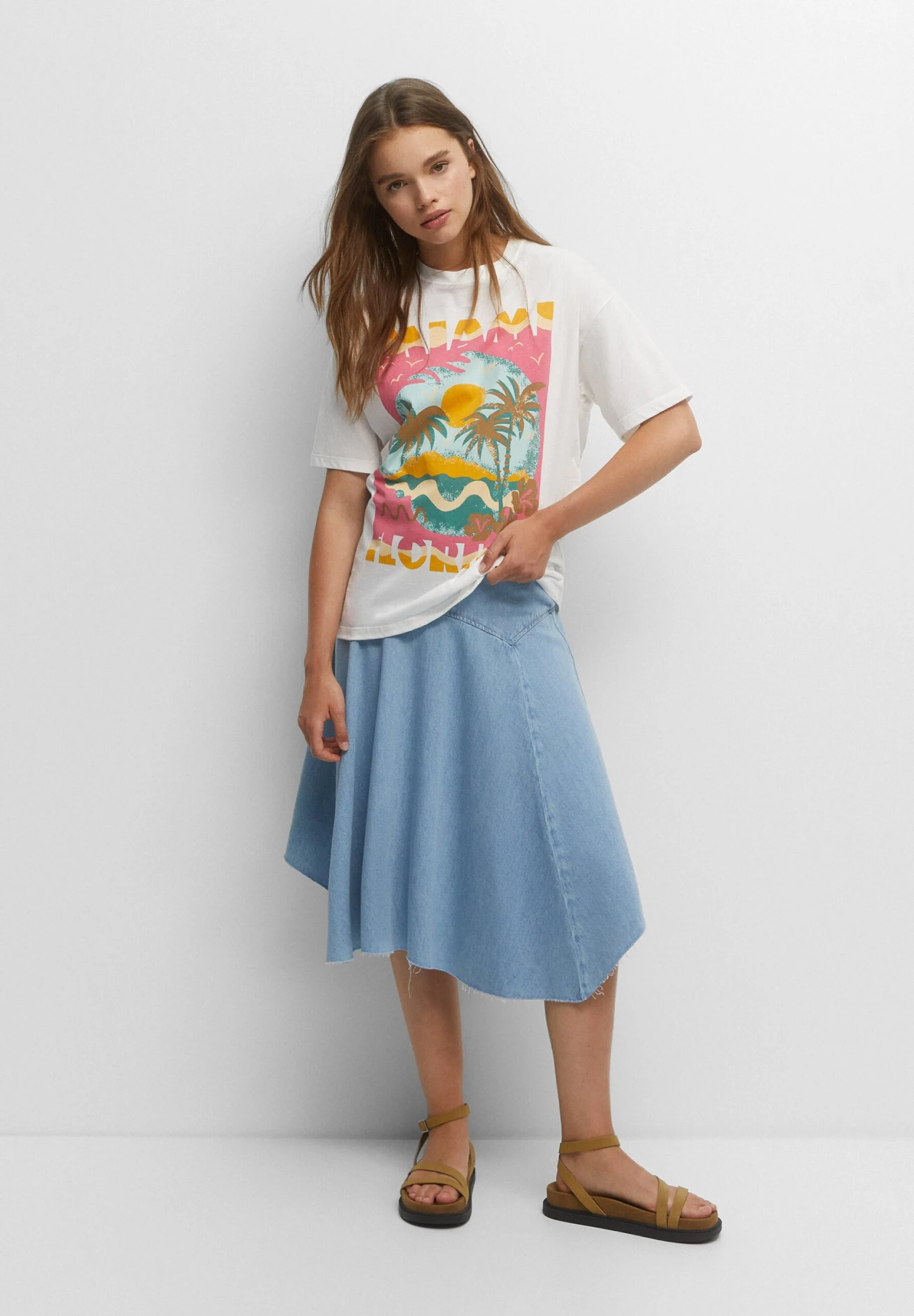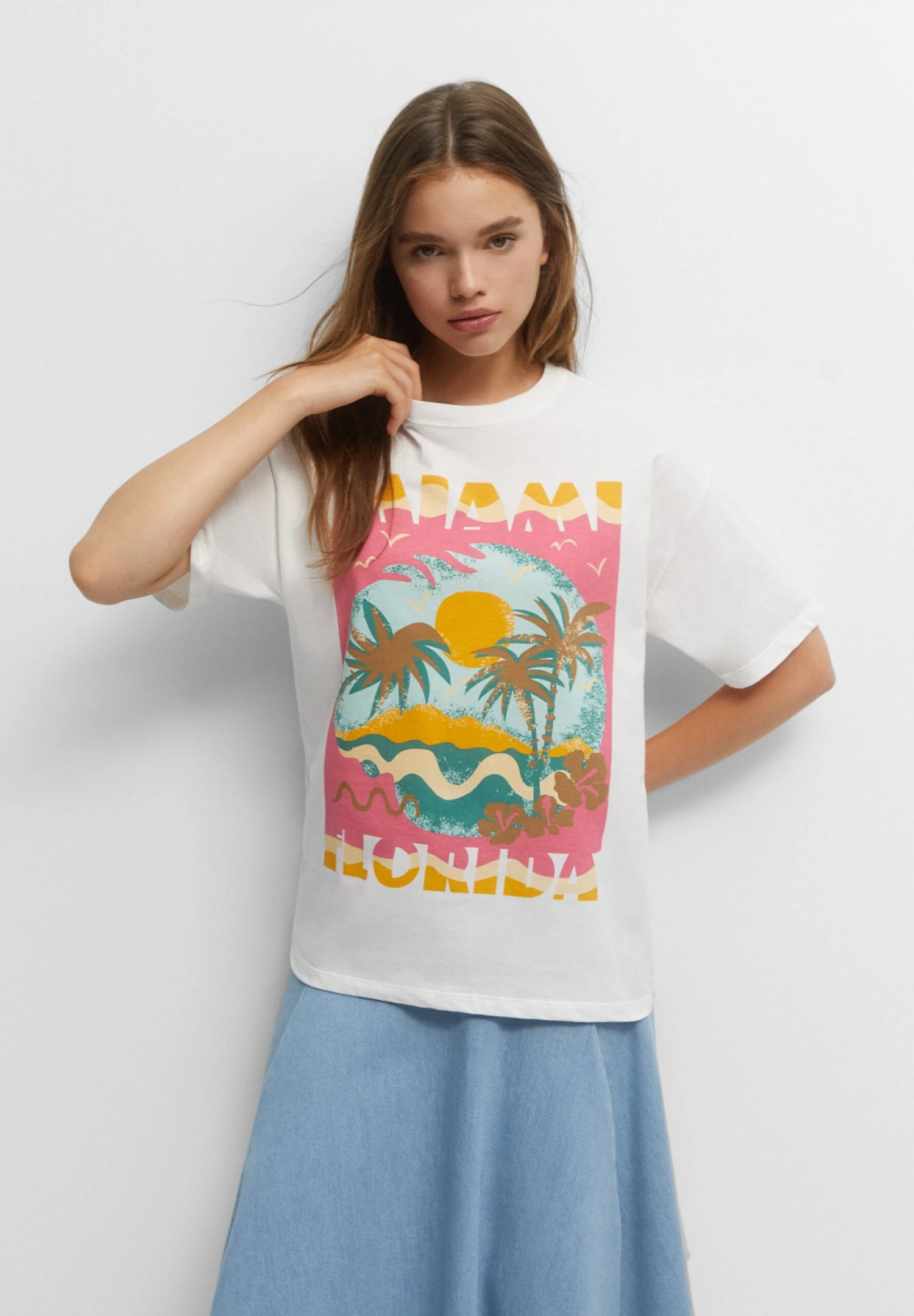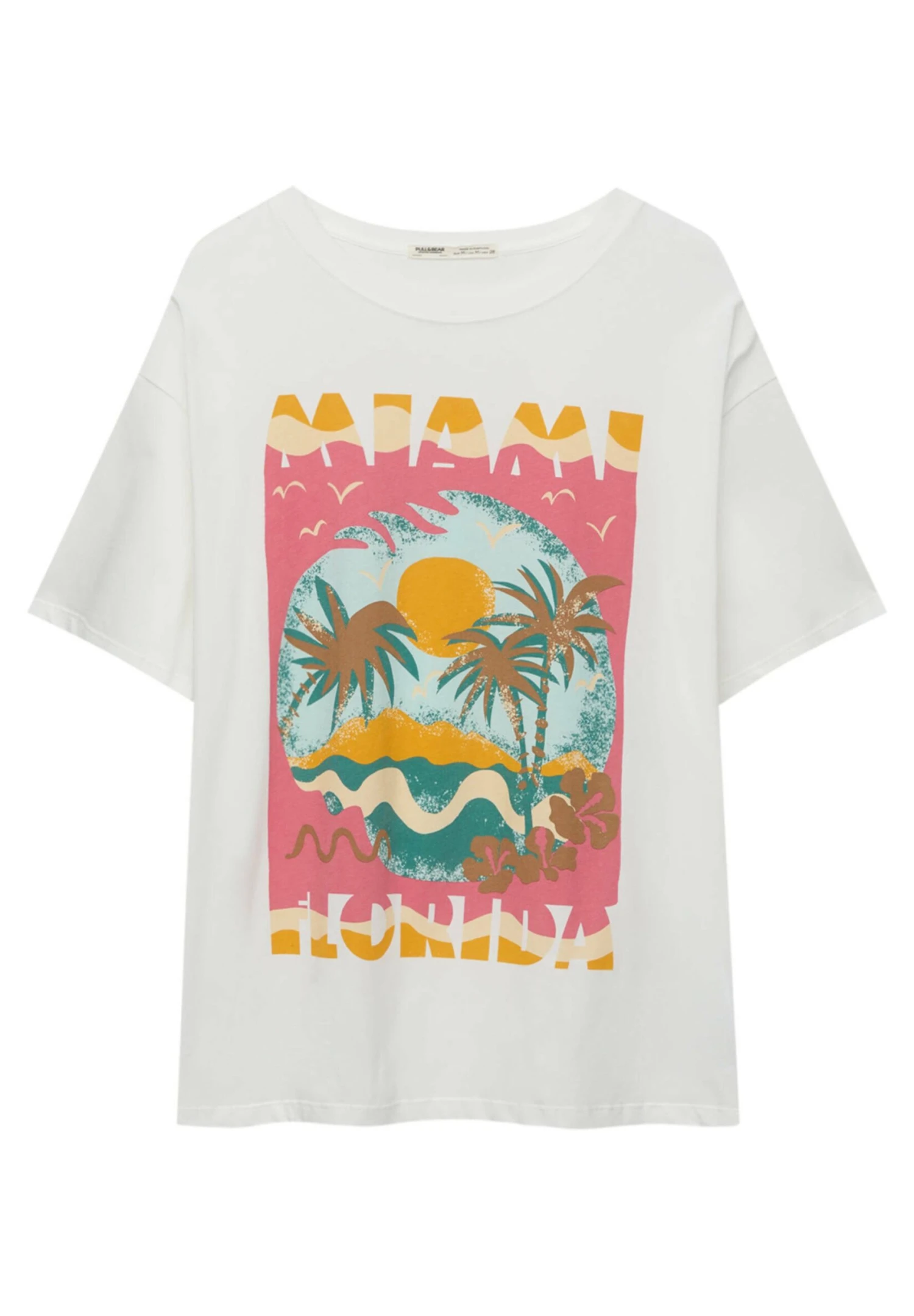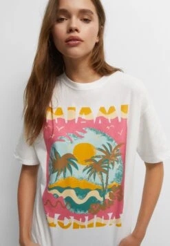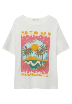 PULL & BEAR Short Sleeve Miami Sunset Graphic – T-Shirt Print – White